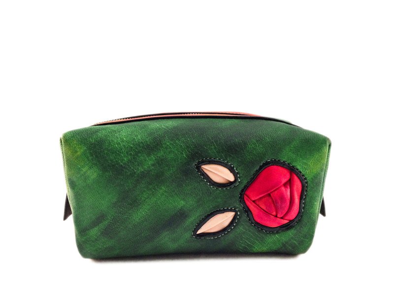 シープスキンをグリーンのグラデーションで手染めしたポーチ。